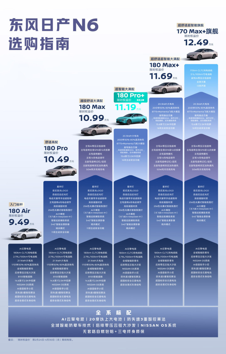 东风日产在开年第一天不仅仅发布了全新一代轩逸的上市价格,同时还更新了三款车型——天籁、日产N6、日产N7,几乎是把6-20万元价格区间的燃油车、插混车、纯电车都重新布局了一波。一看就是东风日产从新年之初就进入了决战状态,直接把强度拉满。